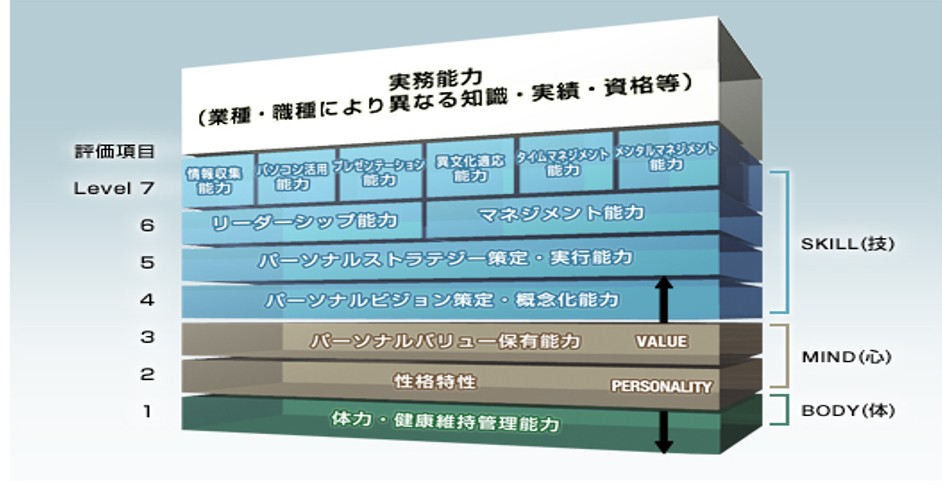 上記はセブンレイヤーズ®という四半世紀以上前から提唱している能力構造のモデルです。図の右手に表示されているように、下から上に、体・心・技という構造で捉えています。表層部分の実務能力は成果と直結している能力です。つまり、“心・技・体”が三位一体となって、成果が生まれるという立脚点に立ったモデルです。